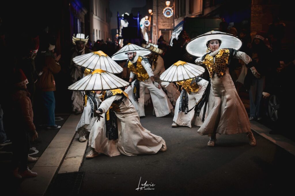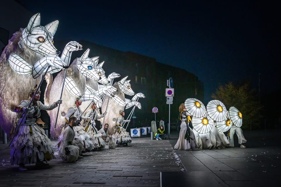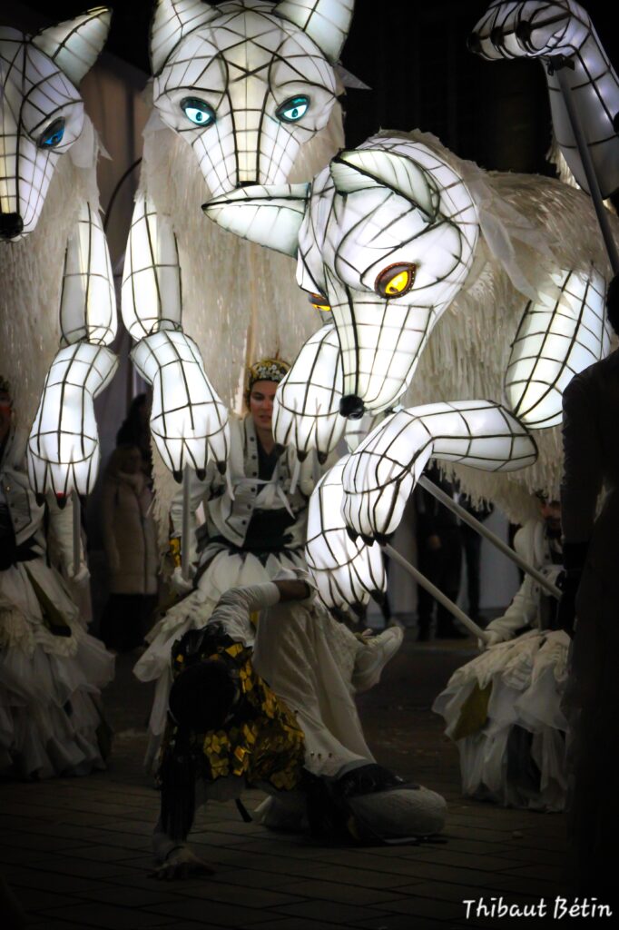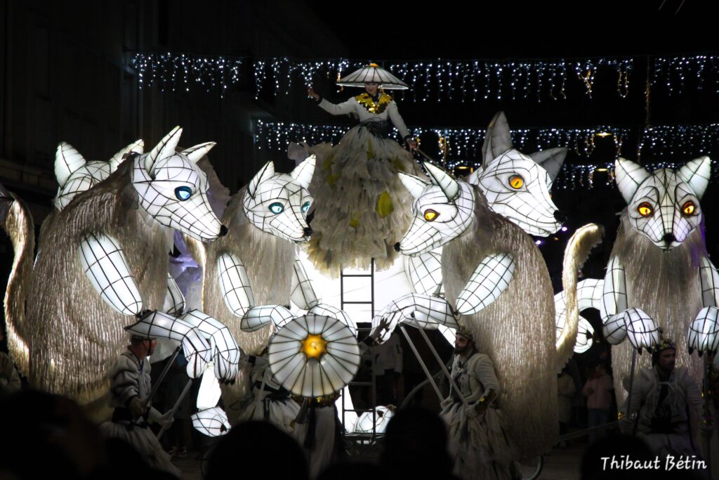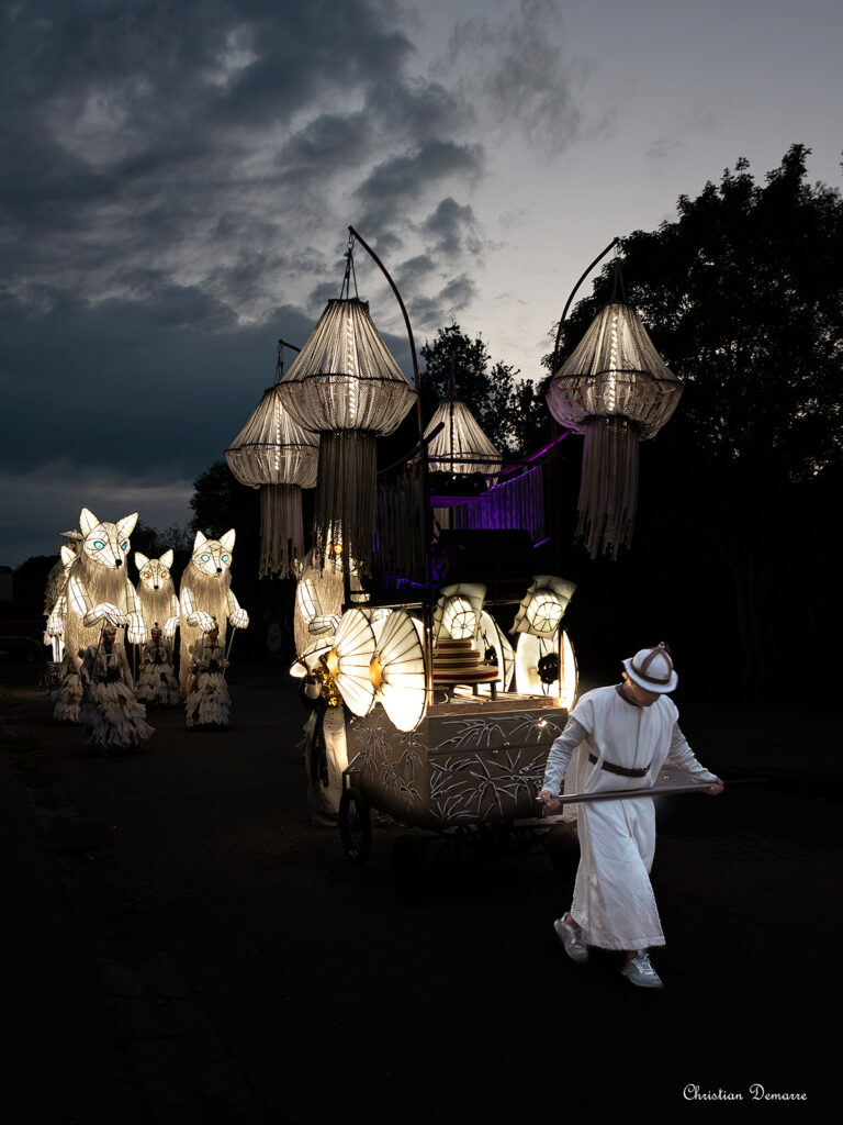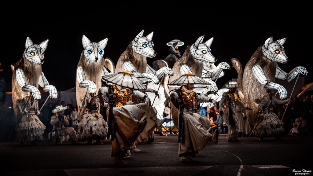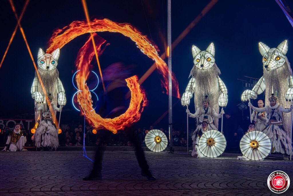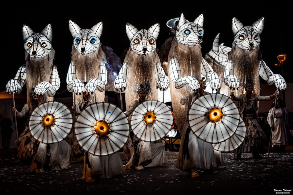 Between dream and reality, an unusual procession embarks on an initiatory journey like a transhumance. At the heart of this journey is a procession of luminous foxes, proud and mysterious creatures accompanied by dancers and acrobats carrying smoke and incandescent lights.