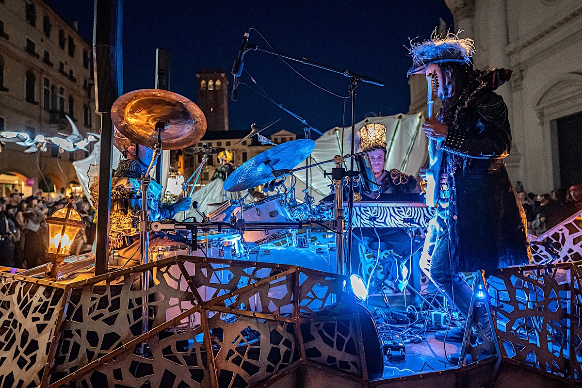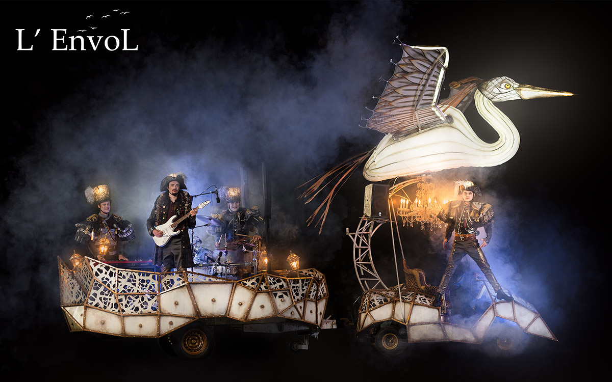 Una procesión maravillosa, un mundo imaginario se desarrolla: un cortejo de personajes, pájaros preciosos y magníficos, que parecen vidrieras colgando del cielo. Nos invitan a seguirlos en su baile aéreo, en un vuelo de fantasía pop-rock alimentado por su energía.
