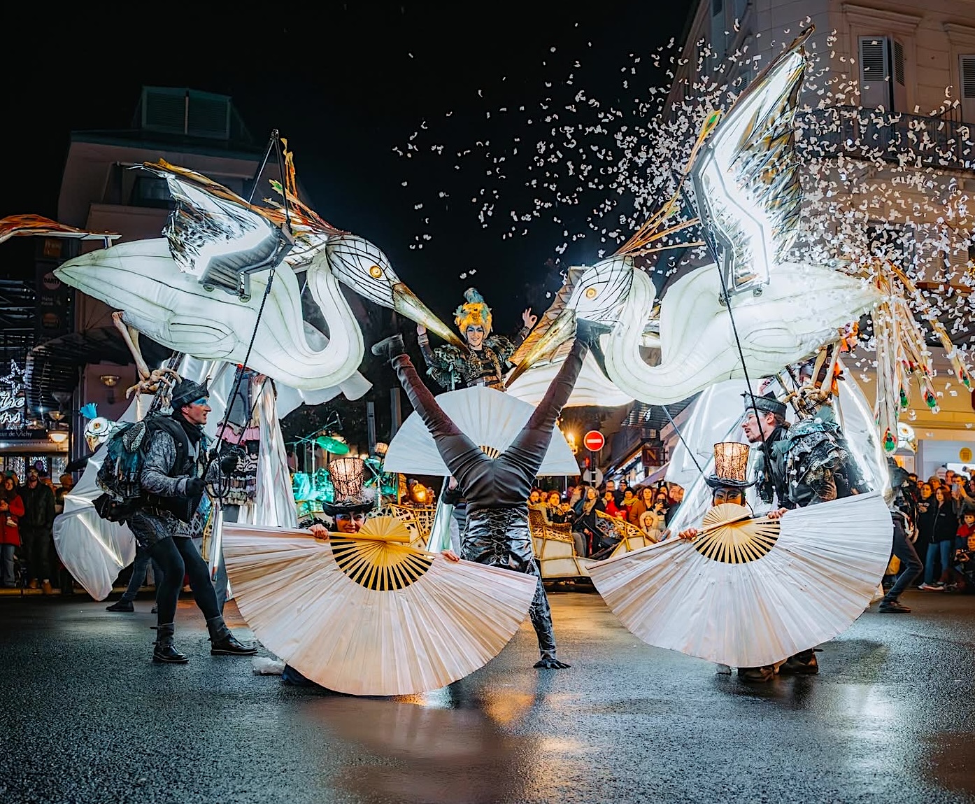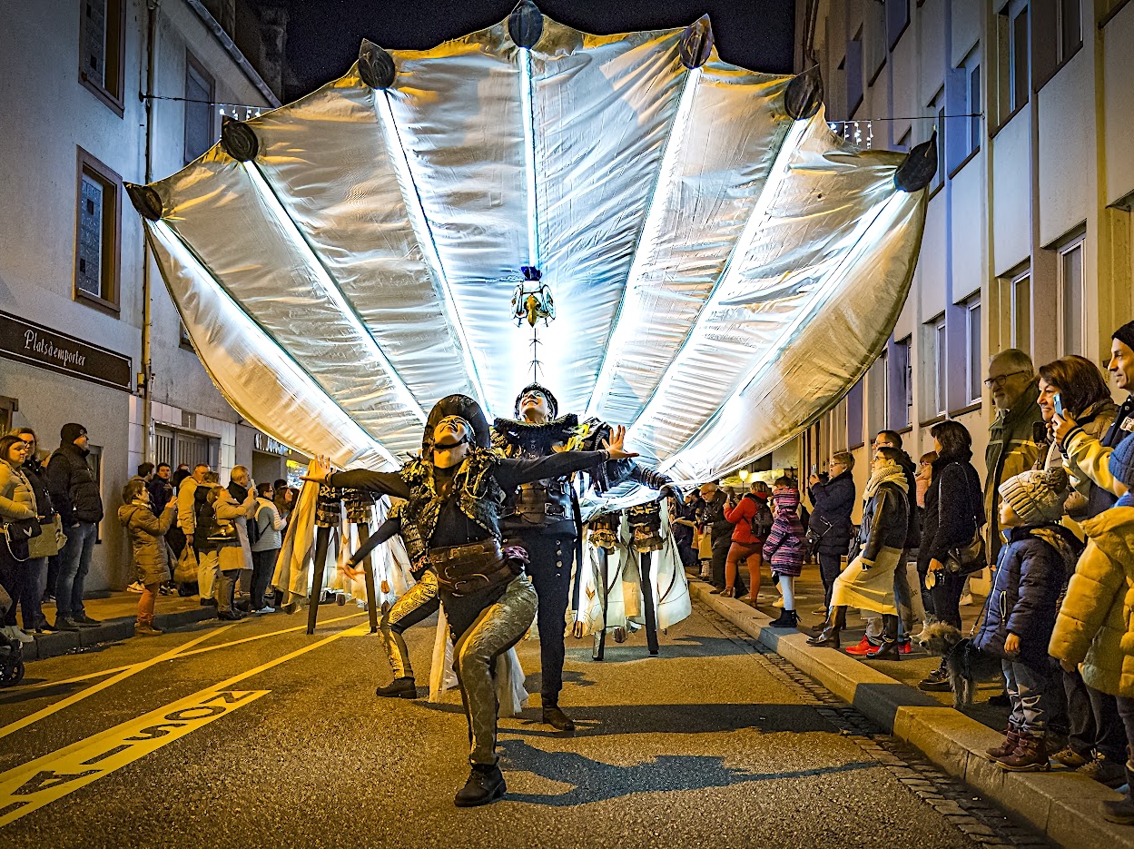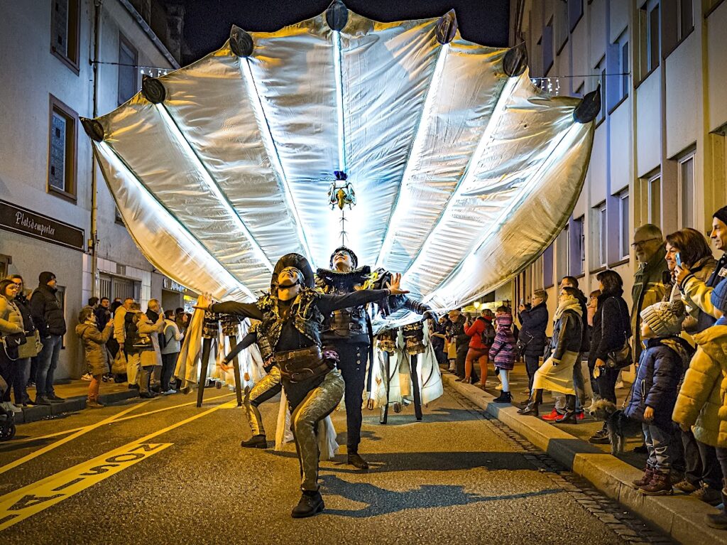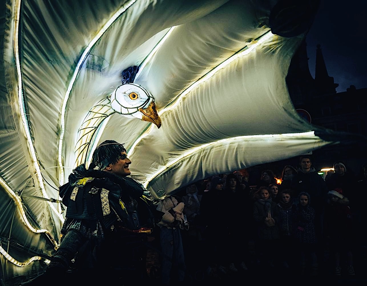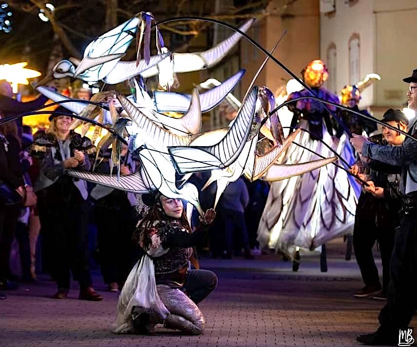- « Los portadores de golondrinas » : Móviles luminosos manipulados por voluntarios de la ciudad, posibilidad hasta 10 personas (Integración de un equipo de la ciudad en el espectáculo – puesta por nuestro equipo artístico)