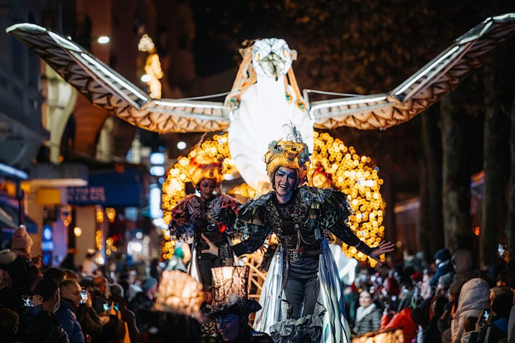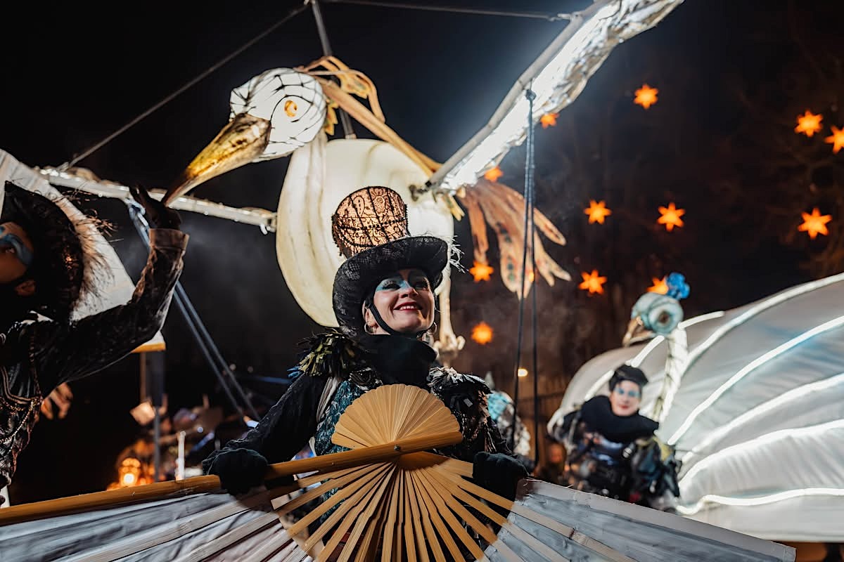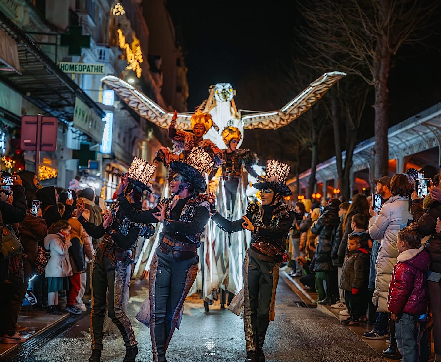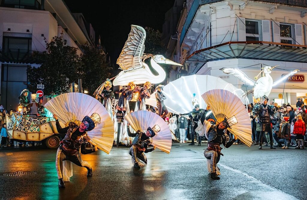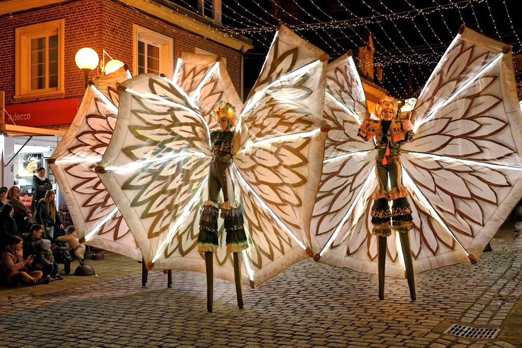 - « Los portadores de golondrinas » : Móviles luminosos manipulados por voluntarios de la ciudad, posibilidad hasta 10 personas (Integración de un equipo de la ciudad en el espectáculo – puesta por nuestro equipo artístico)