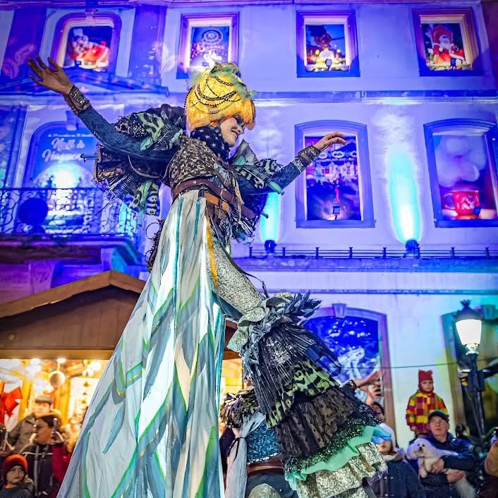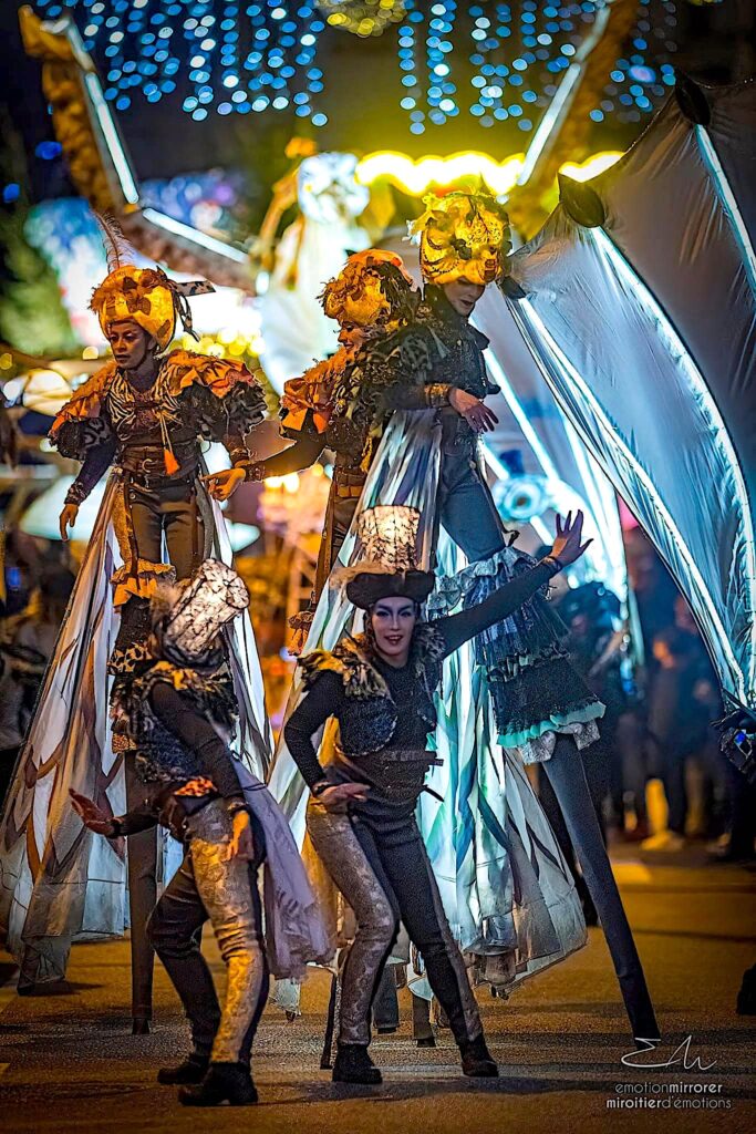- « Las Picaflores » : 3 bailarinas en zancos con vestidos luminosos