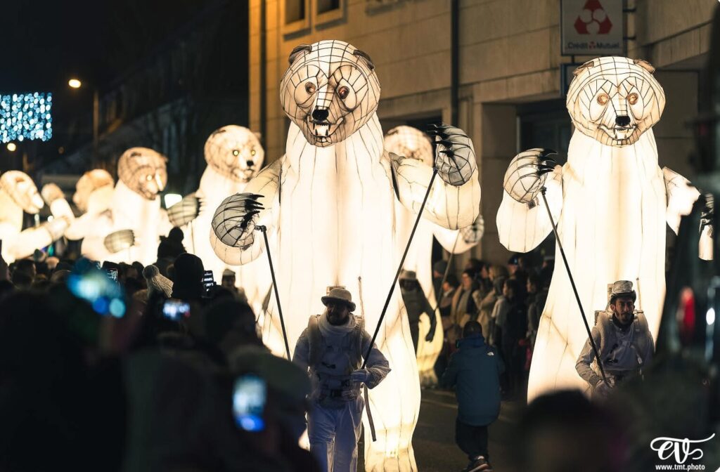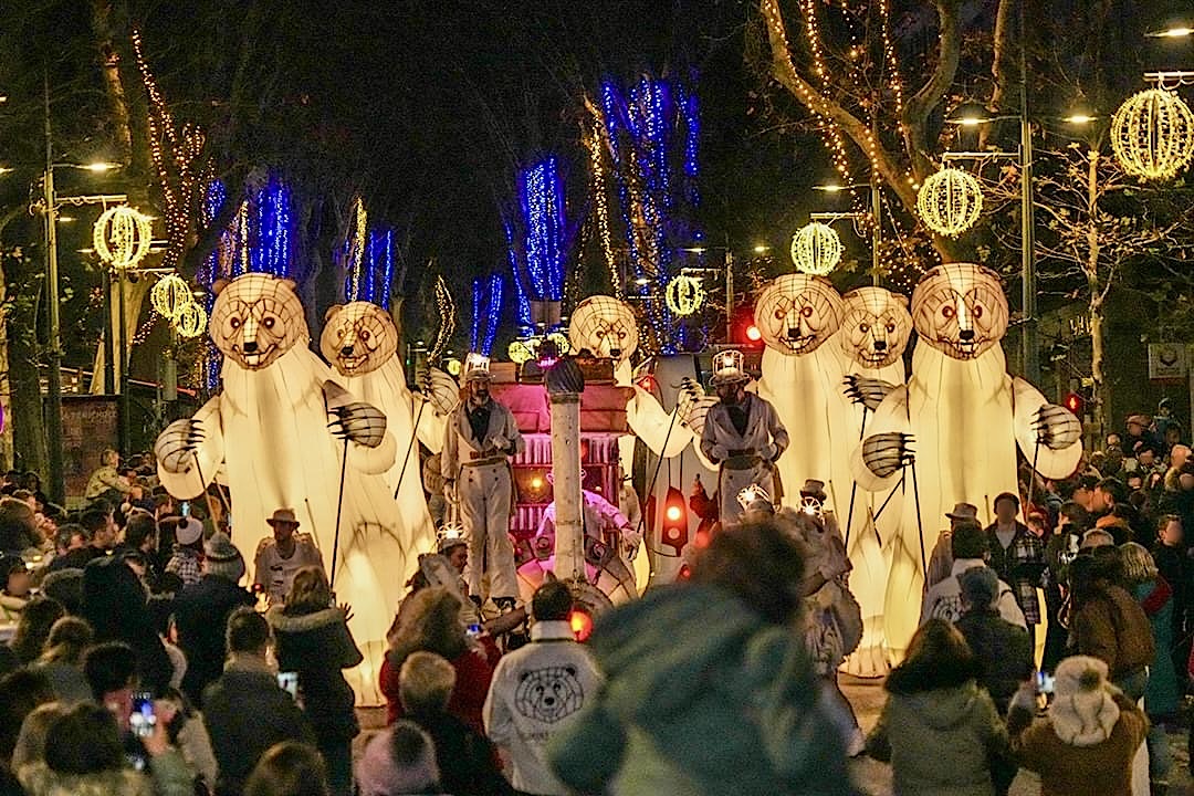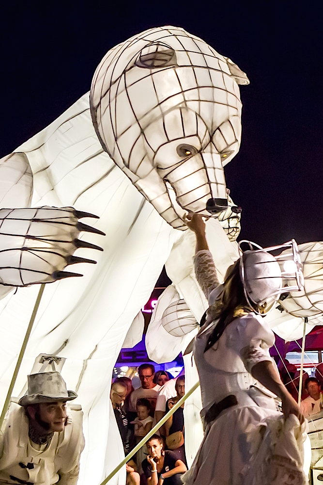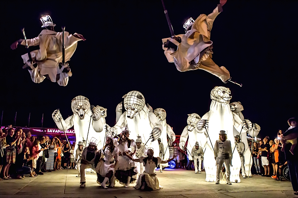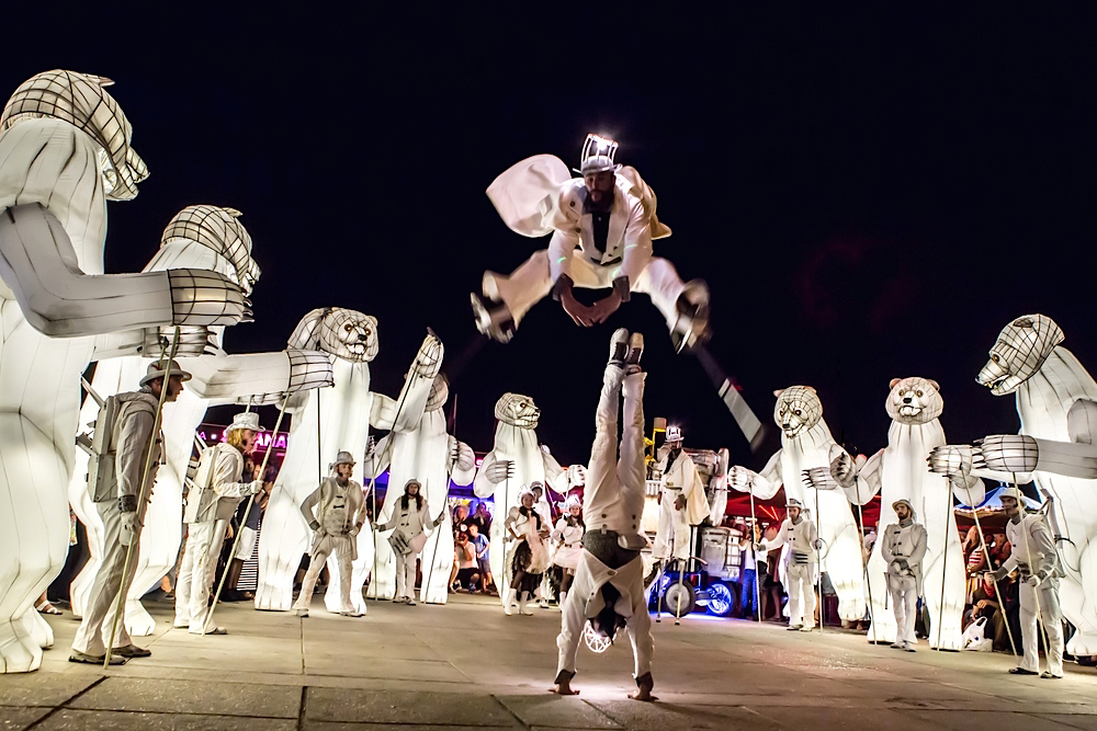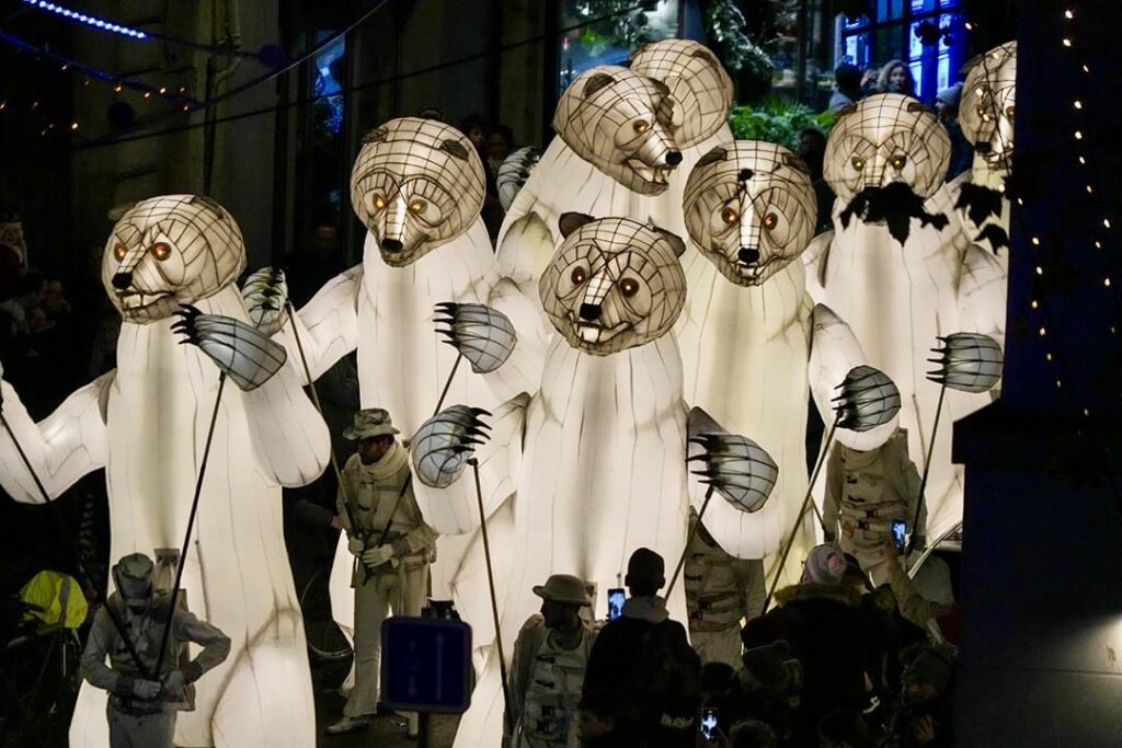 Une horde d’ours lumineux s’avance accompagnée d’extravagantes danseuses, guidées par un séduisant maître de cérémonie sur échasses.