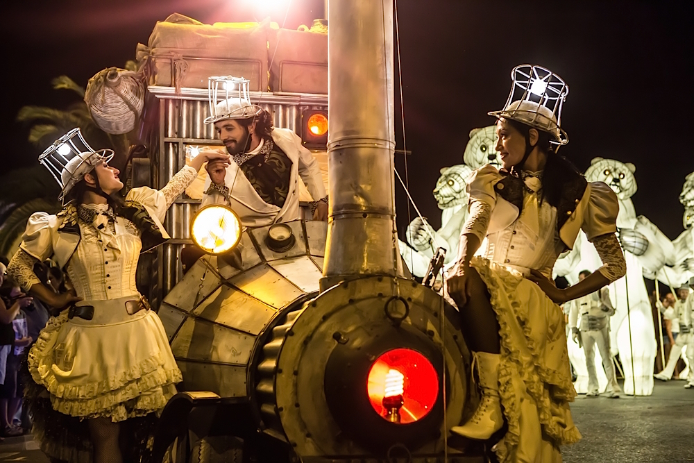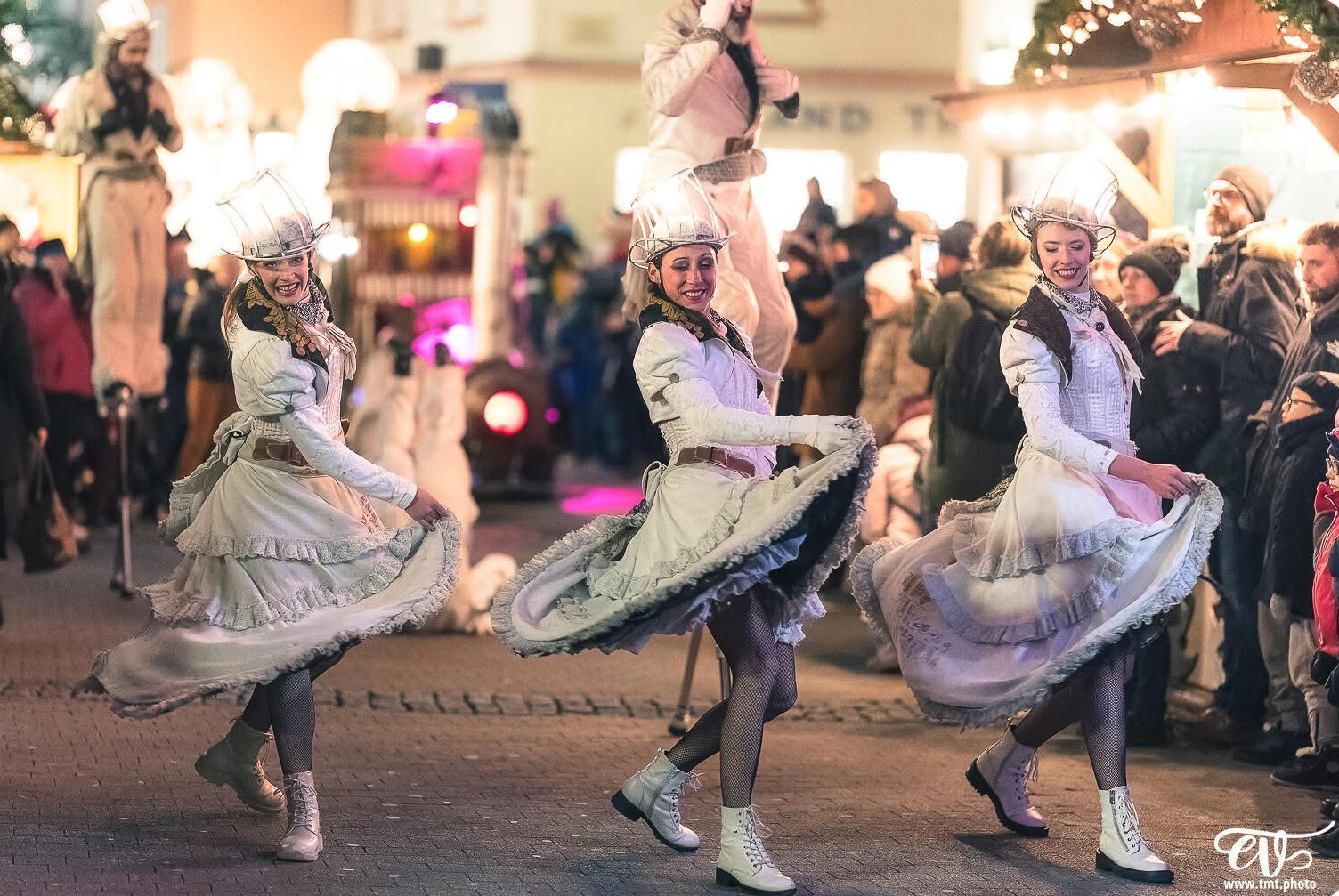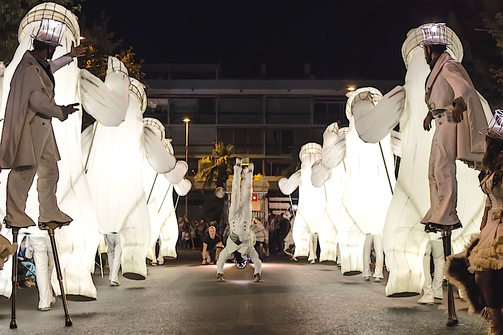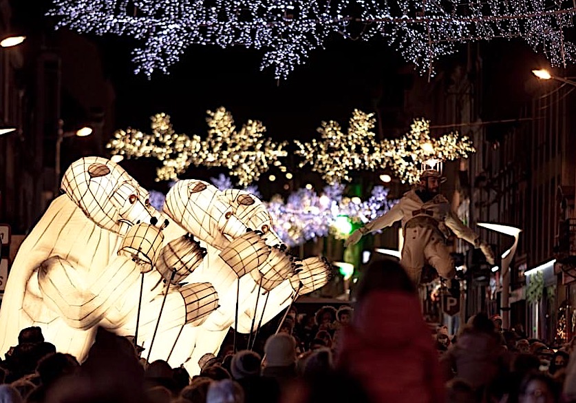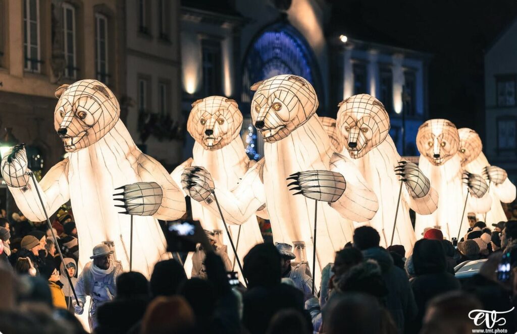 Une horde d’ours lumineux s’avance accompagnée d’extravagantes danseuses, guidées par un séduisant maître de cérémonie sur échasses.